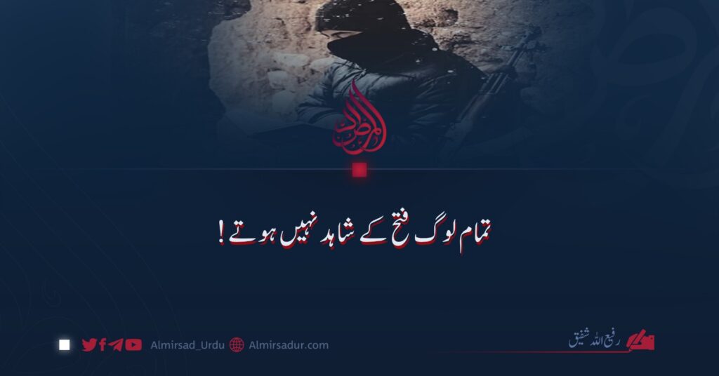 تو ہمارا فرض مقصد کی طرف بڑھنا ہے، نہ کہ نتیجے کی ضمانت۔ ہم جدوجہد کے مکلف ہیں، ظاہری فتح کے نہیں، کیونکہ فتح اللہ تعالی کا وعدہ ہے۔ اور جو بھی اس راہ میں خود کو قربان کرے، چاہے وہ ہدف تک پہنچے یا نہ پہنچے، وہ کامیاب ہے۔