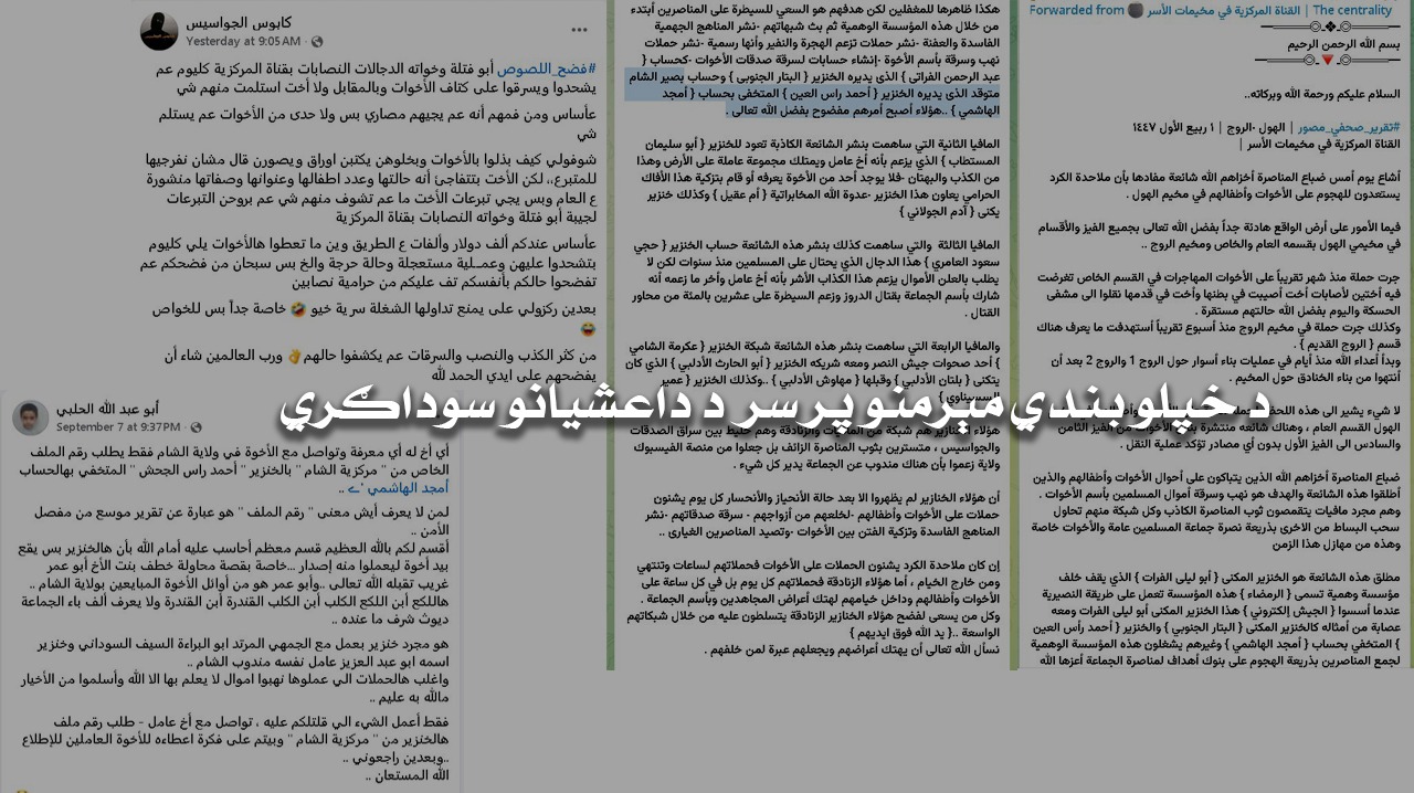 بغدادی اور ہاشمی کے غلاموں کو رسوا کرنے والا چینل کے نام سے ایک میڈیا پلیٹ فارم، جو خوارج کے خلاف سرگرم ہے، نے اپنے اکاؤنٹس پر ایک ٹیلیگرام پوسٹ شائع کی۔ یہ پوسٹ داعشیوں کے اس چینل سے منسوب ہے جو ’’ ولایتِ شام‘‘ میں کیمپوں کی انتظامیہ سے تعلق رکھتا ہے۔ اس پوسٹ میں کچھ داعشیوں پر الزام لگایا گیا ہے کہ وہ الہول اور روج کیمپوں کے نام پر رقوم جمع کرتے ہیں مگر انہیں قیدیوں تک نہیں پہنچاتے۔